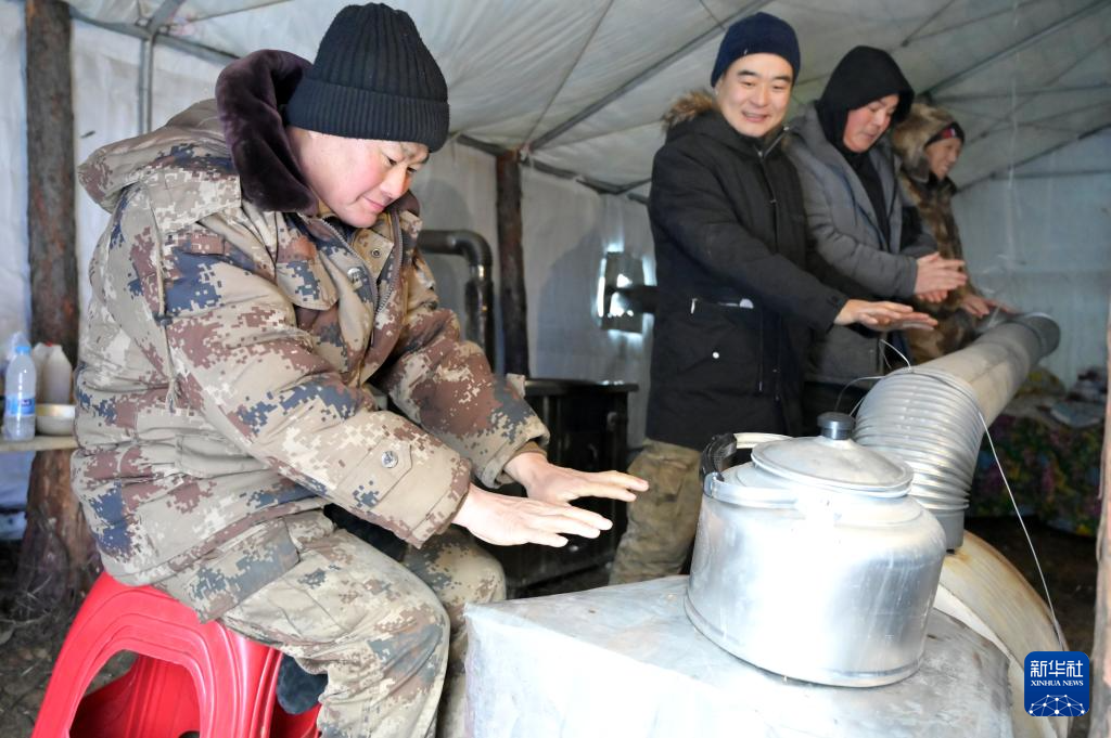 12月24日,在黑龙江省漠河市北极镇北极村周边一处作业点营帐内,漠河林场职工在工作间隙休息。