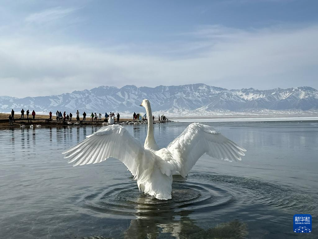 4月6日,游客在新疆博尔塔拉蒙古自治州赛里木湖畔拍照留念。