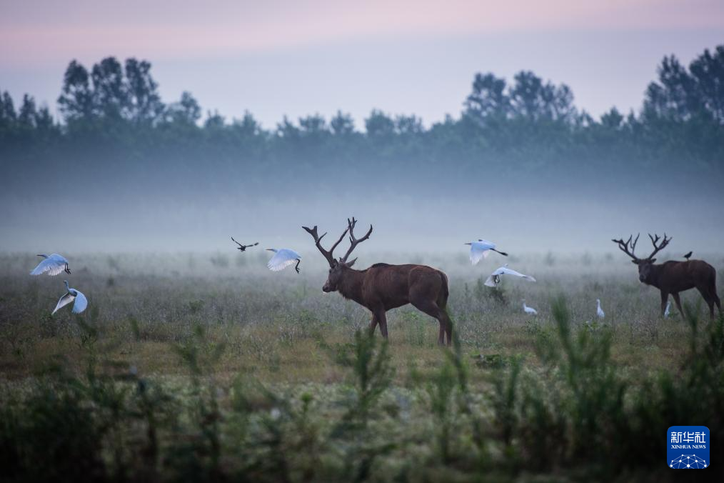 8月1日,两头麋鹿在湖北石首麋鹿国家级自然保护区内活动。