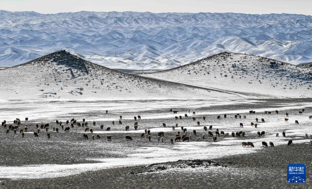 羊群在新疆裕民县巴尔鲁克山南坡的冬牧场上觅食(2月10日摄)。
