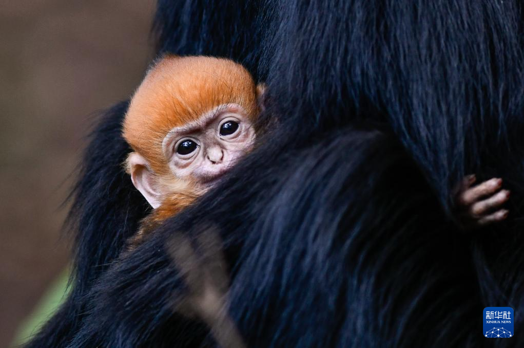 在贵州麻阳河国家级自然保护区拍摄的黑叶猴幼猴(4月30日摄)。新出生的黑叶猴毛色呈金黄色,几个月后逐渐变成黑色。