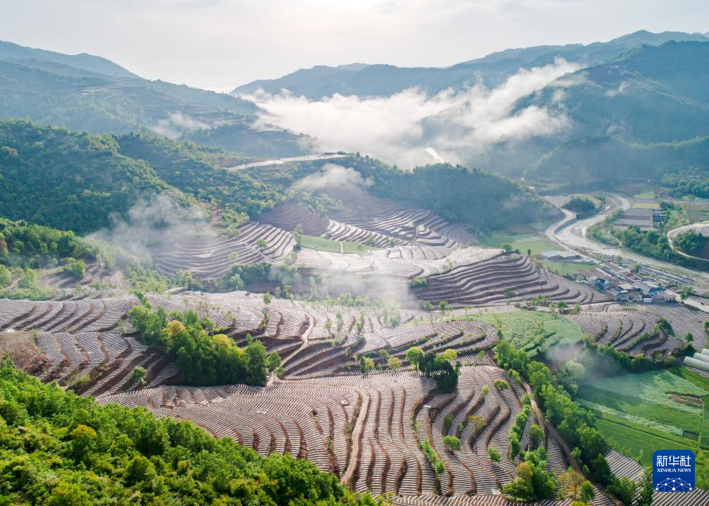 陕西省汉中市略阳县郭镇谭家庄村综合治理后的梯田(4月26日摄,无人机照片)。