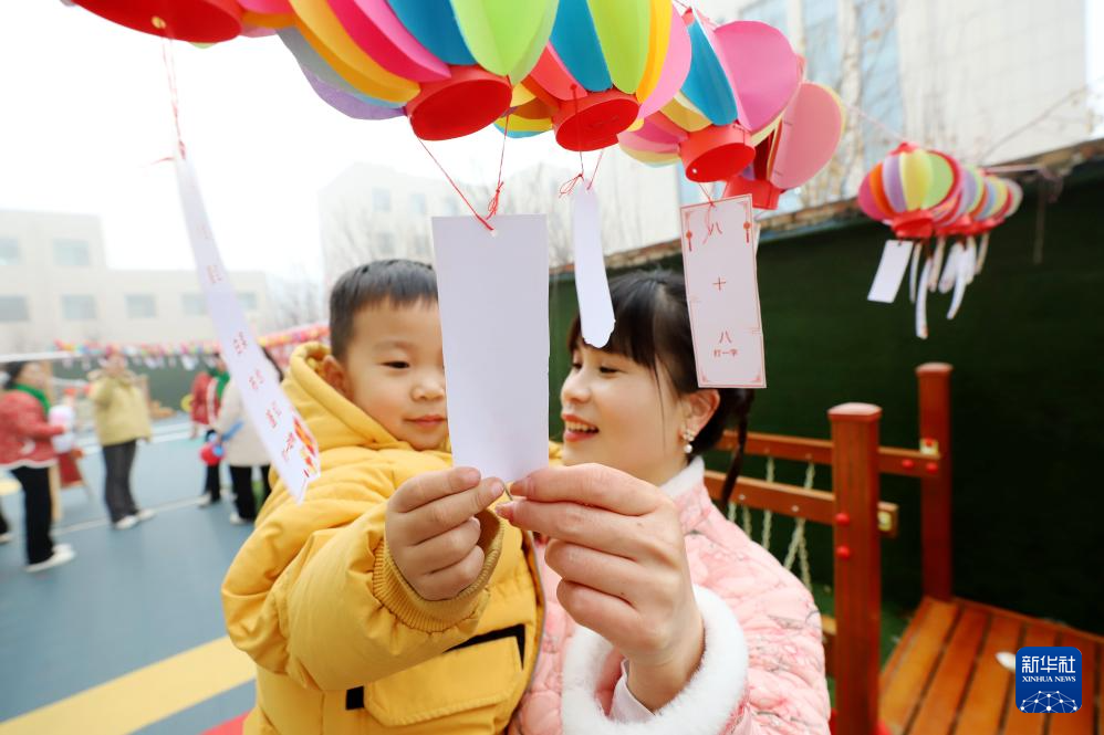 12月30日,在山东省滨州市惠民县一所幼儿园,小朋友和家长一起猜灯谜。