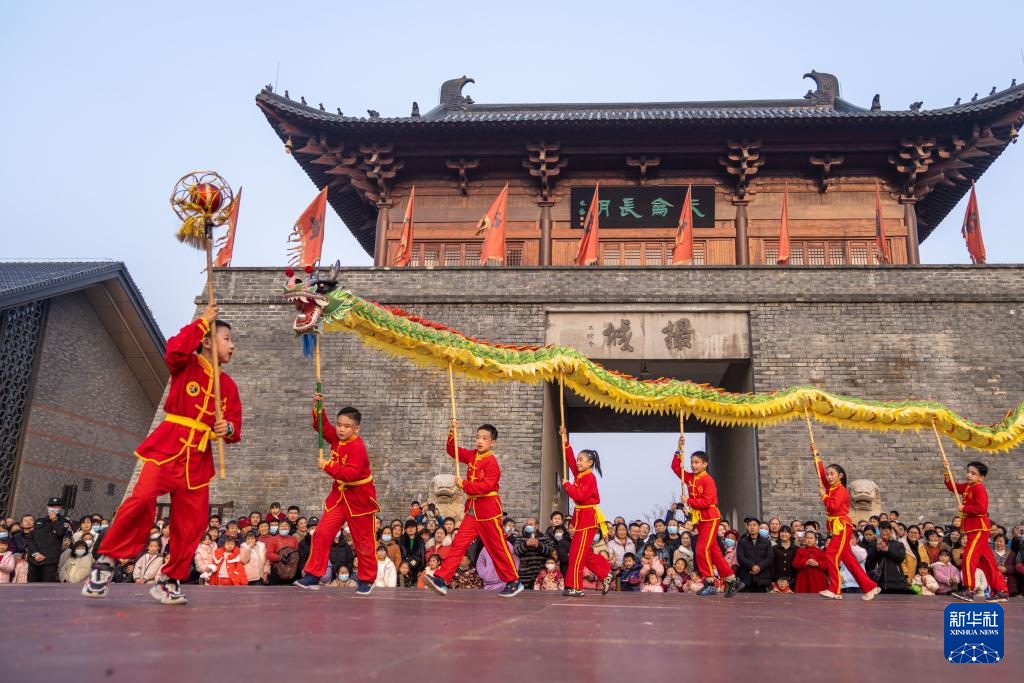 12月30日,在安徽省合肥市肥东县撮街,小朋友在表演舞龙。
