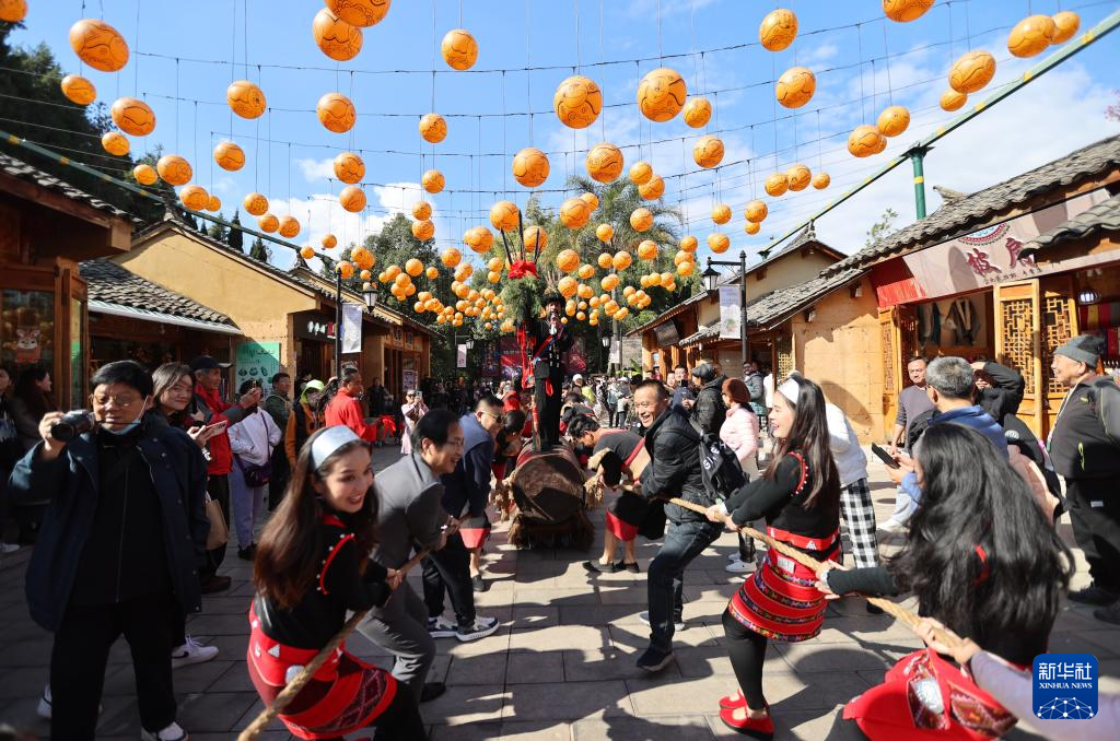 12月30日,在云南省昆明市云南民族村,游客与佤族演员一起体验拉木鼓。