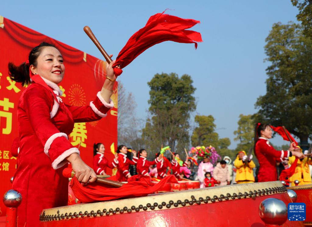 12月30日,在河南省南阳市中国月季园,演员在表演打鼓。