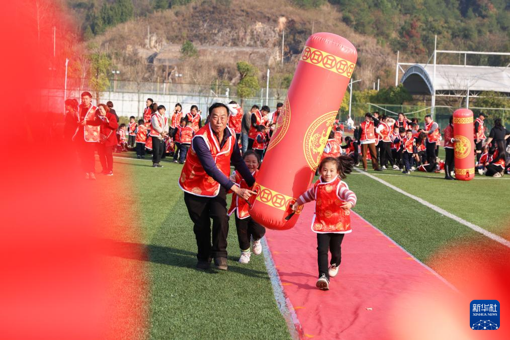 12月30日,家长和小朋友在贵州省黔东南苗族侗族自治州岑巩县一所幼儿园参加迎新年趣味活动。