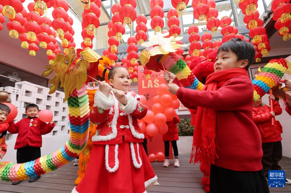 12月30日,在浙江省湖州市德清县雷甸镇社区教育中心,小朋友在表演手工制作的纸龙。