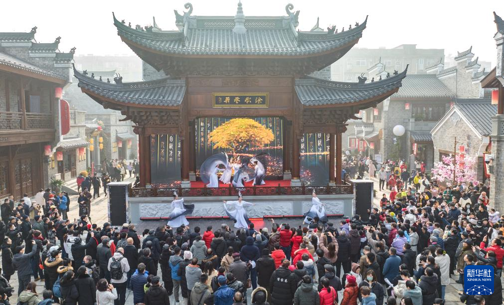 12月30日,游人在湖北省襄阳市古城内的管家巷文化休闲街区观看演出(无人机照片)。