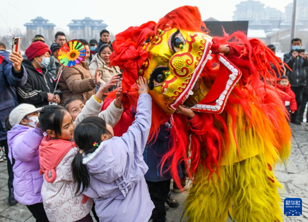 12月30日,民间艺人在河北省遵化市兴旺寨镇一景区表演舞狮。