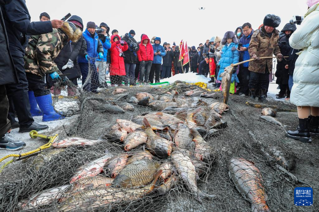 12月30日,游客在河北省沽源县库伦淖尔湖冰面上观看冬捕。