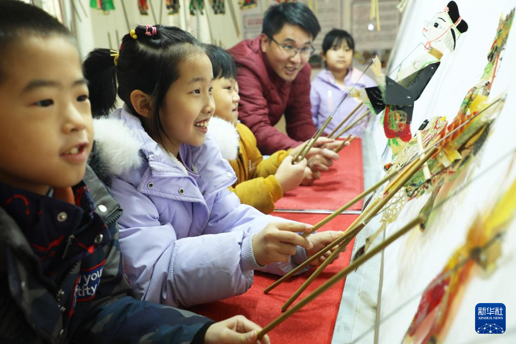12月30日,在河北省唐山市丰润区太平路街道锦祥社区,皮影艺人指导小朋友表演皮影戏。