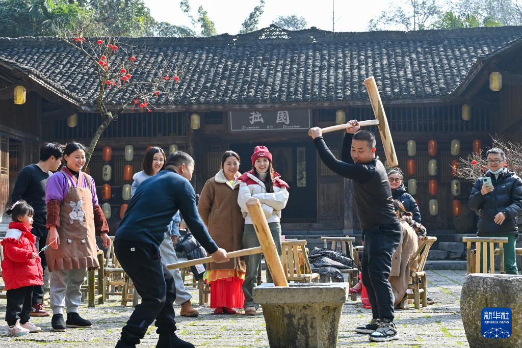 12月30日,游人在重庆市酉阳土家族苗族自治县桃花源景区体验打糍粑。