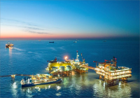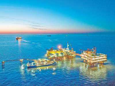 1月25日,位于渤海湾西南部的埕北油田油气处理与岸电设备共建平台——CEPC(中心平台)正式投产,该平台可使油田接入来自陆地的绿色电力,减少海上“自发电”带来的天然气和原油消耗。图为当日拍摄的埕北油田CEPC(右)。