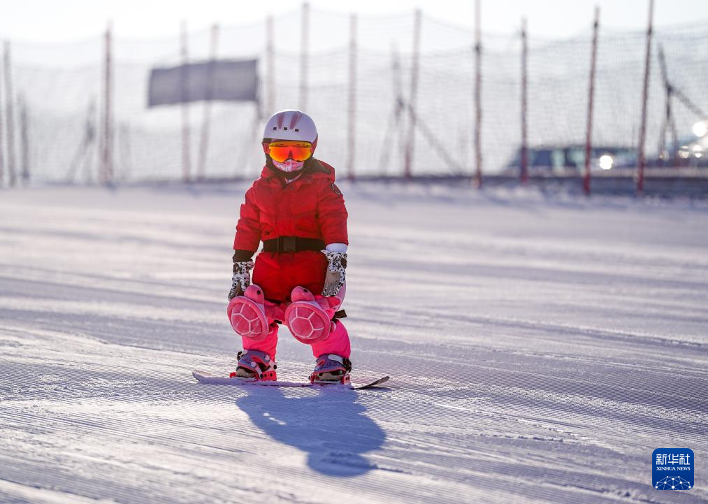 1月25日,小朋友在长春天定山滑雪场滑雪。