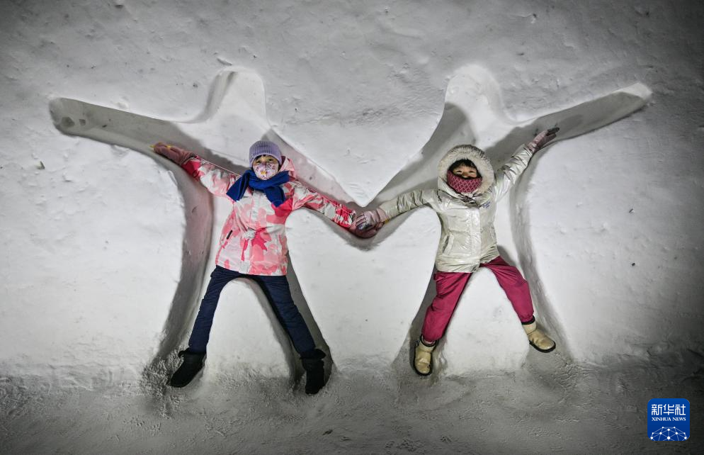 1月26日,游客在长春冰雪新天地的一处冰雪墙摆造型拍照。
