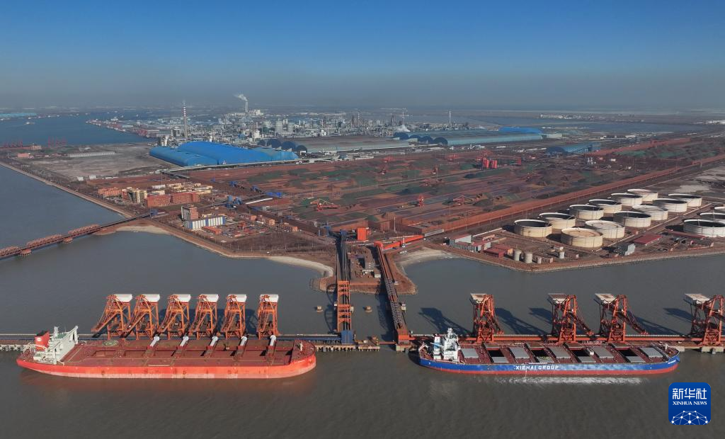 1月26日,两艘轮船靠泊在唐山港曹妃甸港区矿石码头卸载(无人机照片)。
