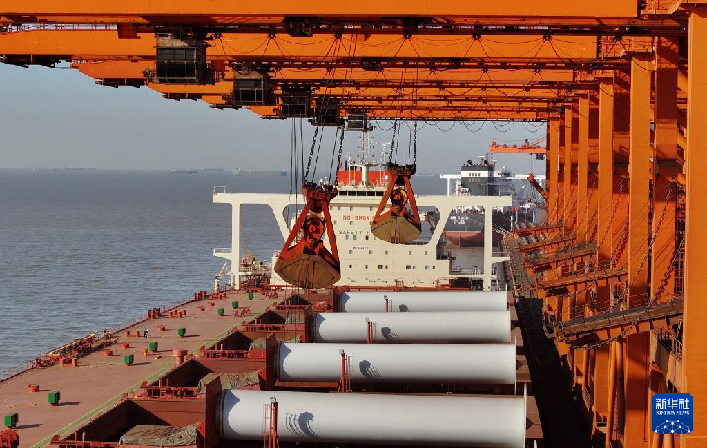 1月26日,一艘轮船靠泊在唐山港曹妃甸港区矿石码头卸载(无人机照片)。