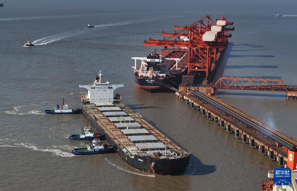 1月26日,一艘轮船在拖轮协助下向唐山港曹妃甸港区矿石码头靠泊(无人机照片)。