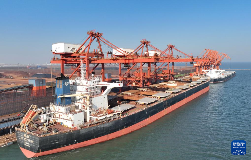 1月28日,两艘轮船靠泊在唐山港京唐港区矿石码头卸载(无人机照片)。