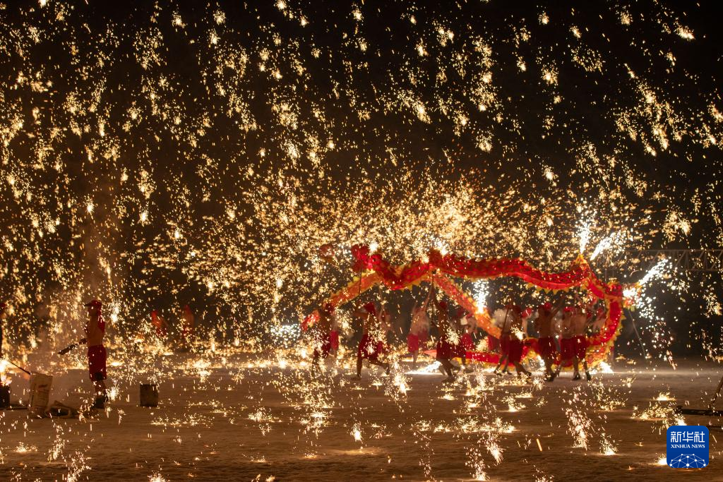 1月29日,在哈尔滨伏尔加庄园,铜梁火龙队的队员表演铜梁龙舞。