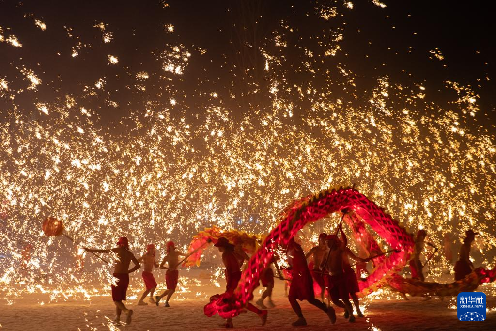 1月29日,在哈尔滨伏尔加庄园,铜梁火龙队的队员表演铜梁龙舞。