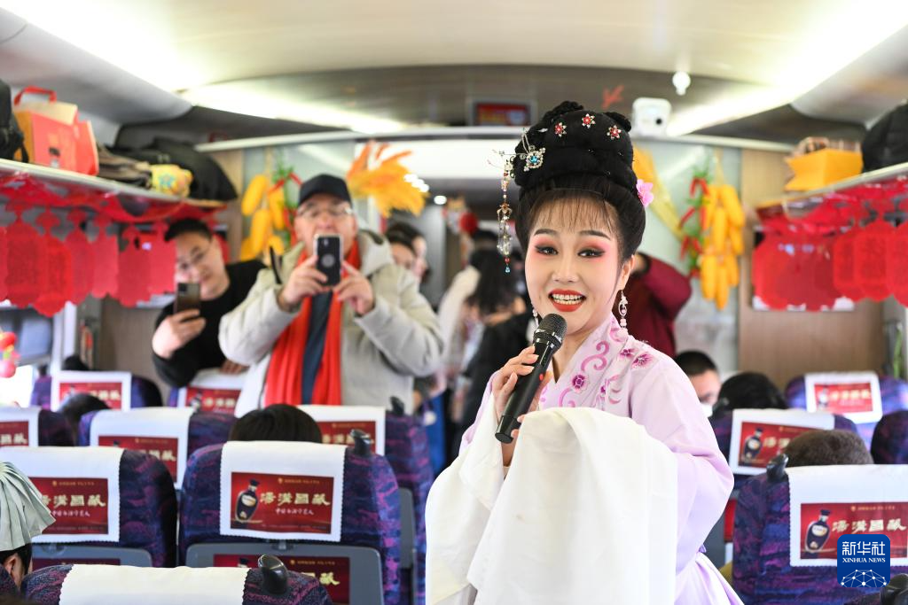 1月29日,演员在G7575次列车上表演黄梅戏。