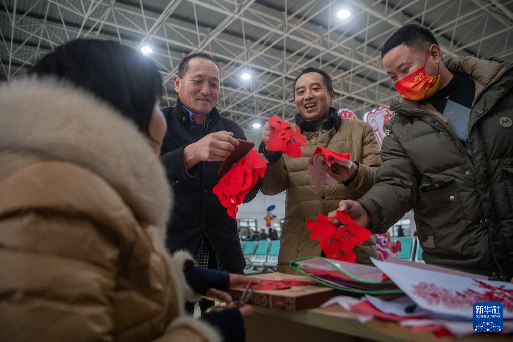 2月1日,旅客在麻城站候车大厅领取铁路工作人员送的剪纸。