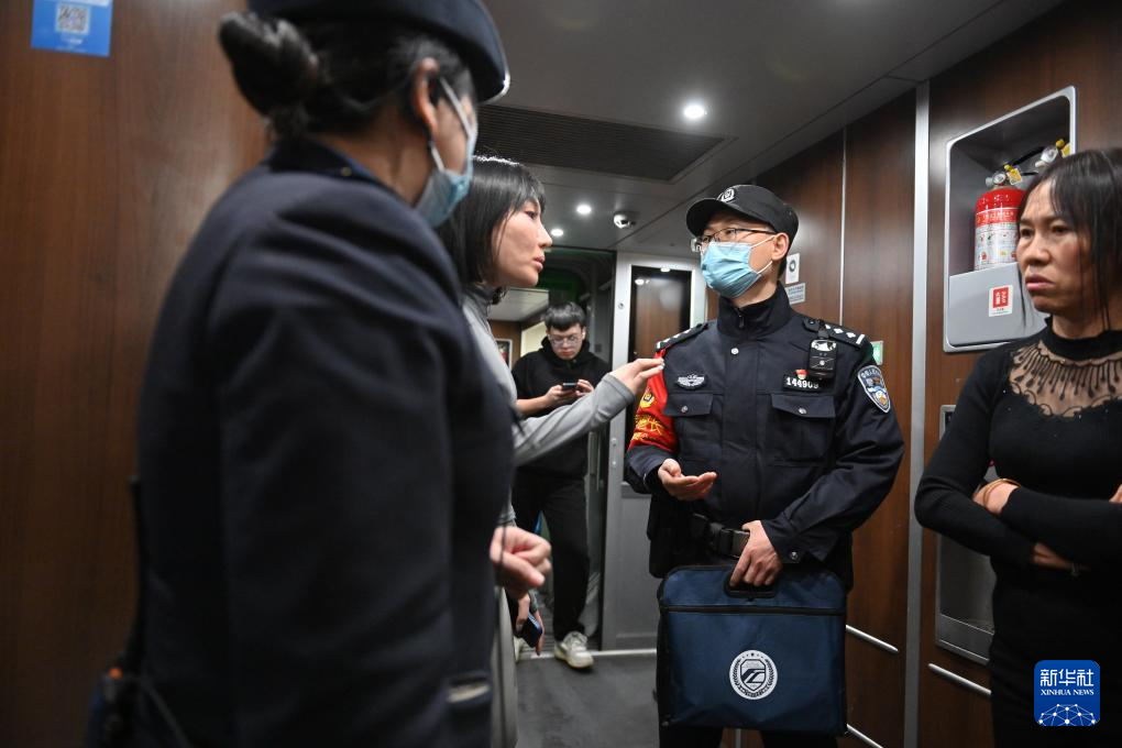 2月3日,在D59次列车上,乘警长王志阳(中)在调解旅客之间的小摩擦。