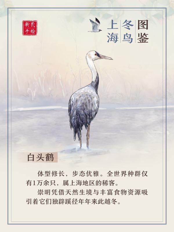 ️白头鹤体型修长,步态优雅。全世界种群仅有1万余只,属上海地区的稀客。崇明凭借天然生境与丰富食物资源吸引着它们独辟蹊径年年来此越冬。