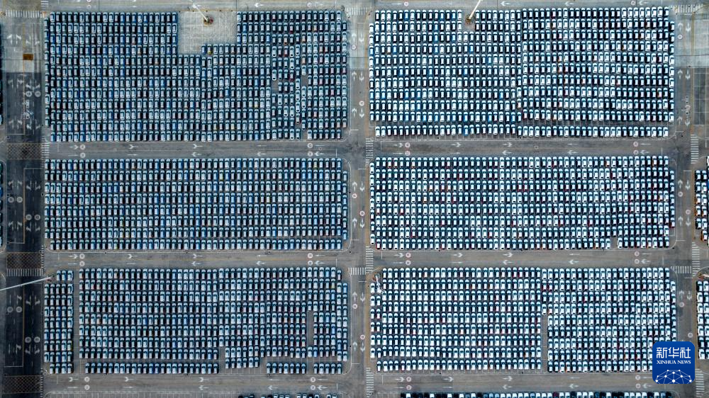 2月3日,汽车整齐排列在天津港海嘉滚装码头(无人机照片)。