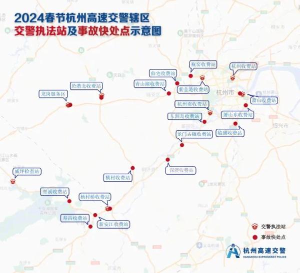 春节期间,杭州高速交警在辖区的龙岗服务区、萧山收费站、杨村桥收费站、紫金港收费站、杭州南收费站、杭州收费站、威坪综合检查站、於潜北收费站设置8个春运交警执法站,开展过往车辆检查、服务工作。设置事故快速处理点16个,分别为G56杭徽高速龙岗服务区、青山湖收费站,G92杭甬高速新萧山收费站,G60杭金衢高速萧山东收费站、临浦收费站,G4012溧宁高速新安江收费站、寿昌收费站,G6021杭长高速杨村桥收费站,S14杭长(宜)高速瓶窑收费站,S43杭州绕城西复线仙宅收费站、G25杭新景高速东洲岛收费站、龙门古镇收费站、深澳收费站,G4012溧宁高速青溪收费站、S29临建高速於潜北收费站、横村收费站。