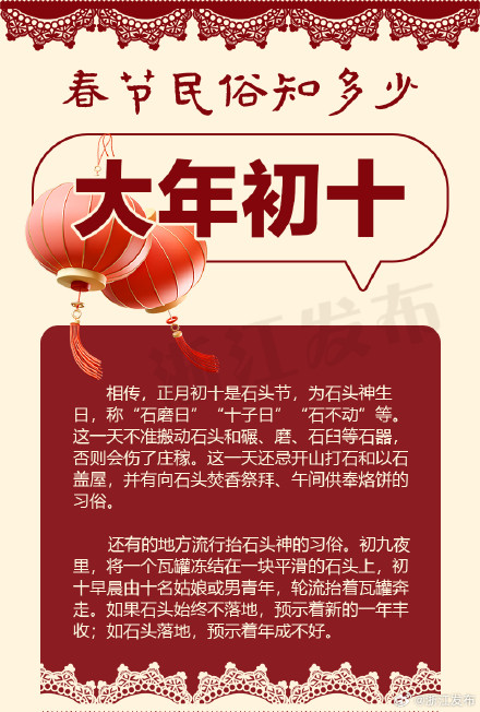 相传,正月初十是石头节,为石头神生日,称“石磨日”“十子日”“石不动”等。这一天不准搬动石头和碾、磨、石臼等石器,否则会伤了庄稼。这一天还忌开山打石和以石盖屋,并有向石头焚香祭拜、午间供奉烙饼的习俗。via人民日报
