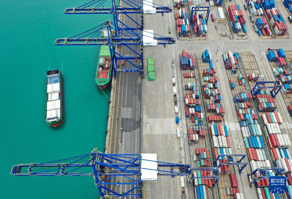 集装箱货轮在海南洋浦国际集装箱码头装卸货物(3月13日摄,无人机照片)。