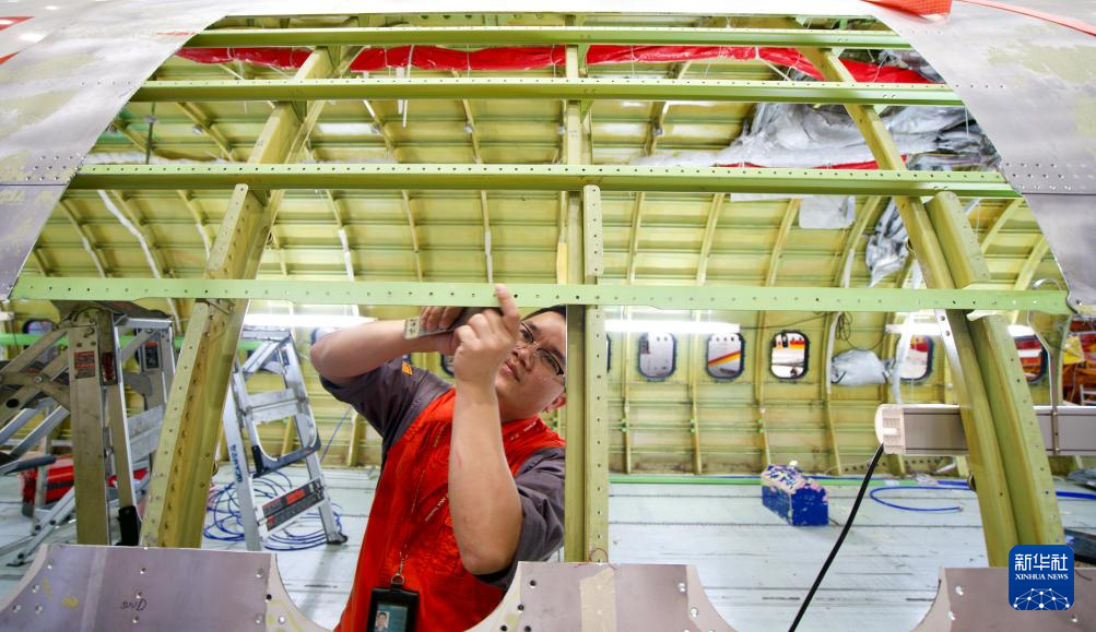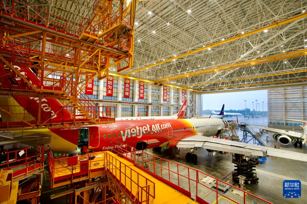 3月11日,在海南一站式飞机维修产业基地定检机库,海航技术旗下大新华飞机维修服务有限公司的工作人员对进境飞机进行检修作业。