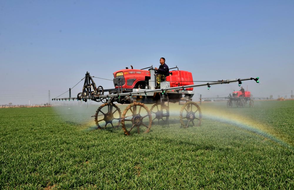 2024年3月12日,河北省邢台市南和区史召乡北高五村农民驾驶农机在麦田喷洒农药。新华社记者 王晓 摄