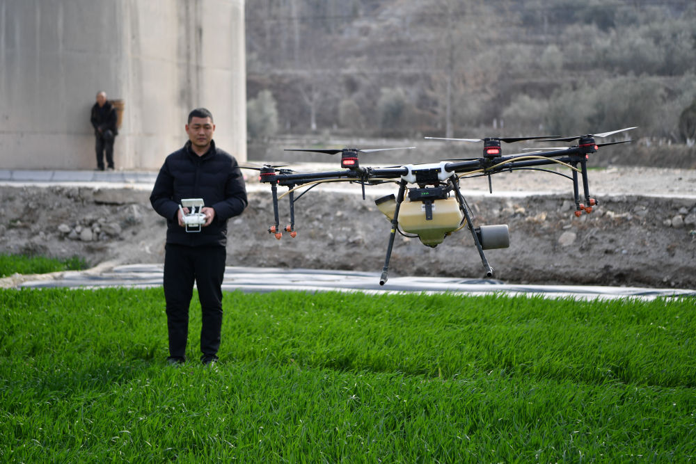 2024年3月9日,甘肃省陇南市武都区汉王镇农业技术推广站技术人员杨亮亮操作植保无人机给冬小麦施肥。新华社记者 陈斌摄