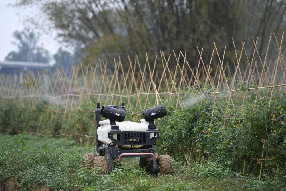 在广州莲塘村举行的黄埔区春耕春播现场会上,一台自行走农机在进行喷洒作业(2024年3月15日摄)。新华社记者 邓华摄