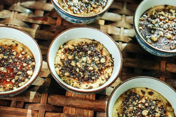 姜汁调蛋,自然也是要先用老姜榨汁,不过这次会将其与瘦肉、黄酒混合入锅煮开,微微放凉;然后倒入拌匀的蛋液,轻轻搅拌后放锅内蒸,等蛋羹成形;15分钟后,再将核桃、芝麻、红糖等混合物撒在表面,继续蒸制。