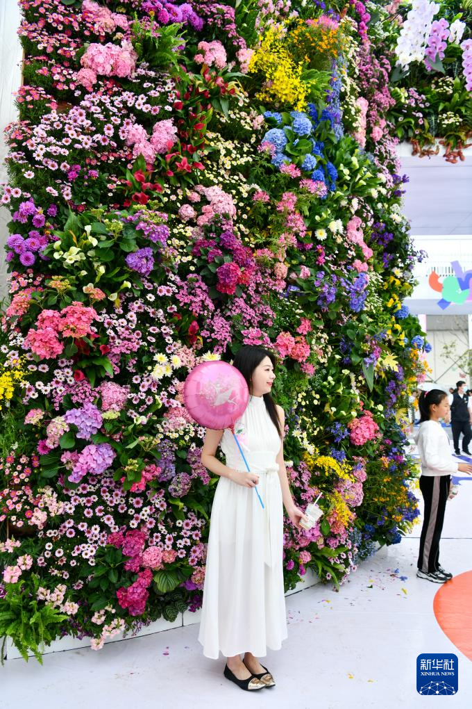 3月23日,观众在花墙前拍照。
