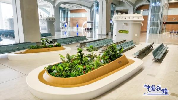 候车厅内设有重点旅客候车区、儿童活动区和休闲区等。金属工艺的牌匾、珐琅镀金工艺的二十四节气印章装饰、“只争朝夕”的千年轮……这座超级高铁站里,还有许多独具匠心的设计。