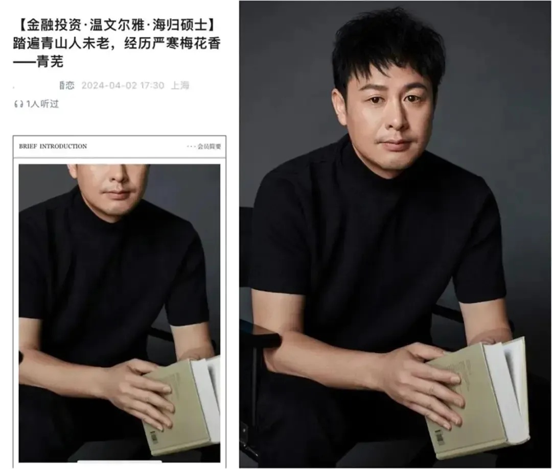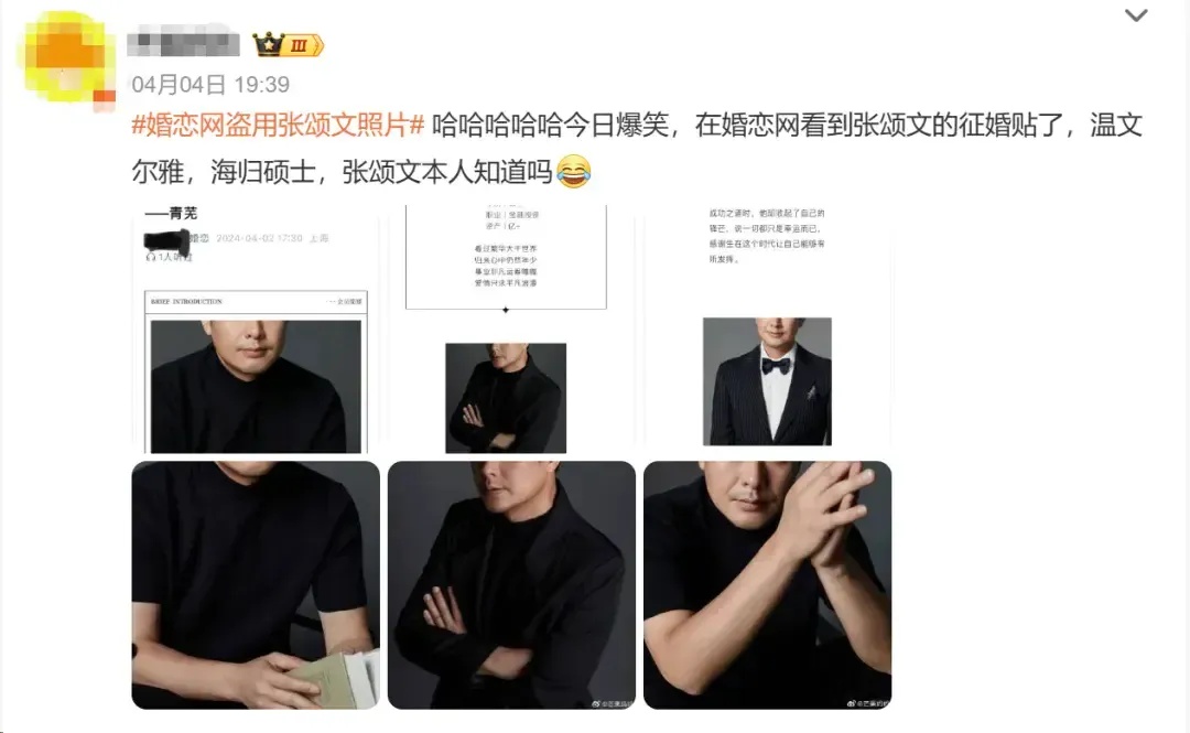 涉嫌盗用张颂文照片的征婚帖标题为“【金融投资·温文尔雅·海归硕士】踏遍青山人未老,经历严寒梅花香——青芜”。居住上海,是一名硕士,从事金融投资,资产过亿。