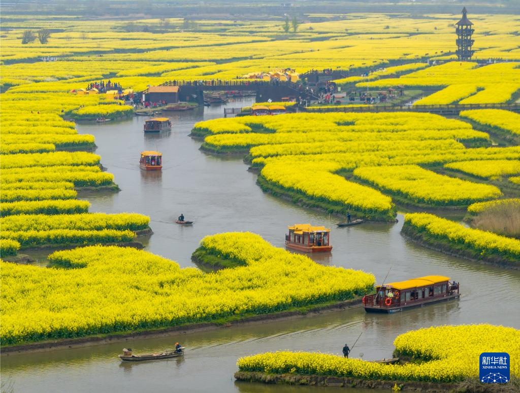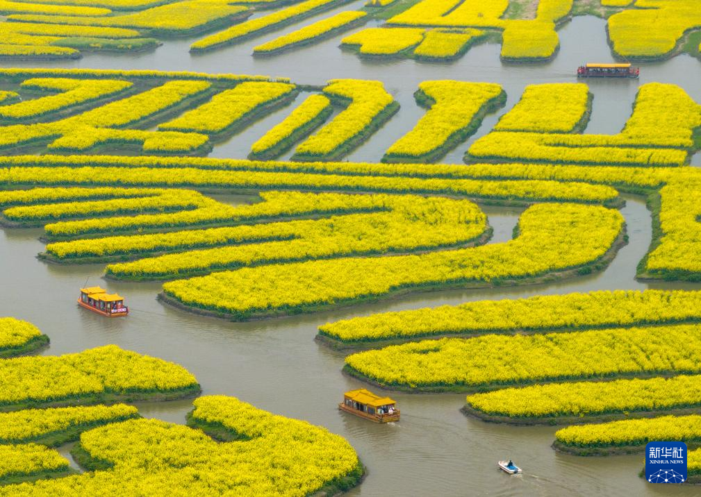 4月8日,游客在江苏省兴化市千垛菜花景区乘船游玩(无人机照片)。