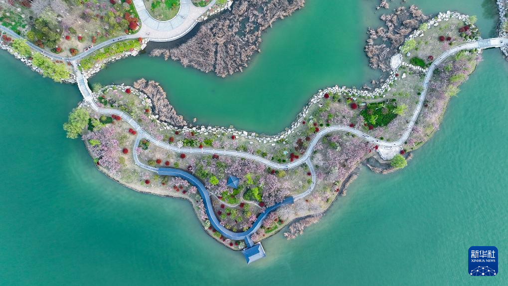 4月8日,市民在河南省商丘市日月湖景区樱花岛赏花游玩(无人机照片)。