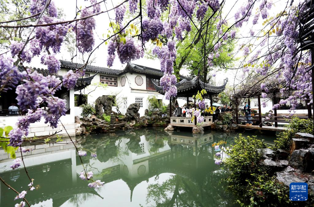 4月8日,游客在江苏扬州瘦西湖风景区内赏花。