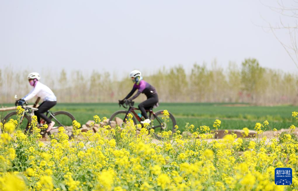4月8日,骑行爱好者在山东省临沂市郯城县郯城街道乡间道路上骑行。