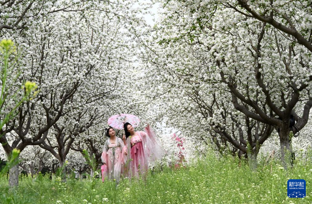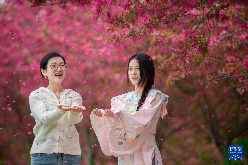 4月8日,游客在河北省邯郸市峰峰矿区义井镇万亩秀林的海棠林里游玩。