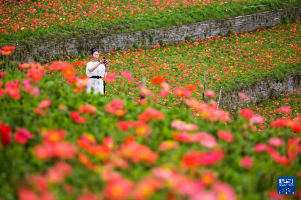 4月8日,游客在贵州省贵阳市乌当区花画小镇景区里赏花游玩。