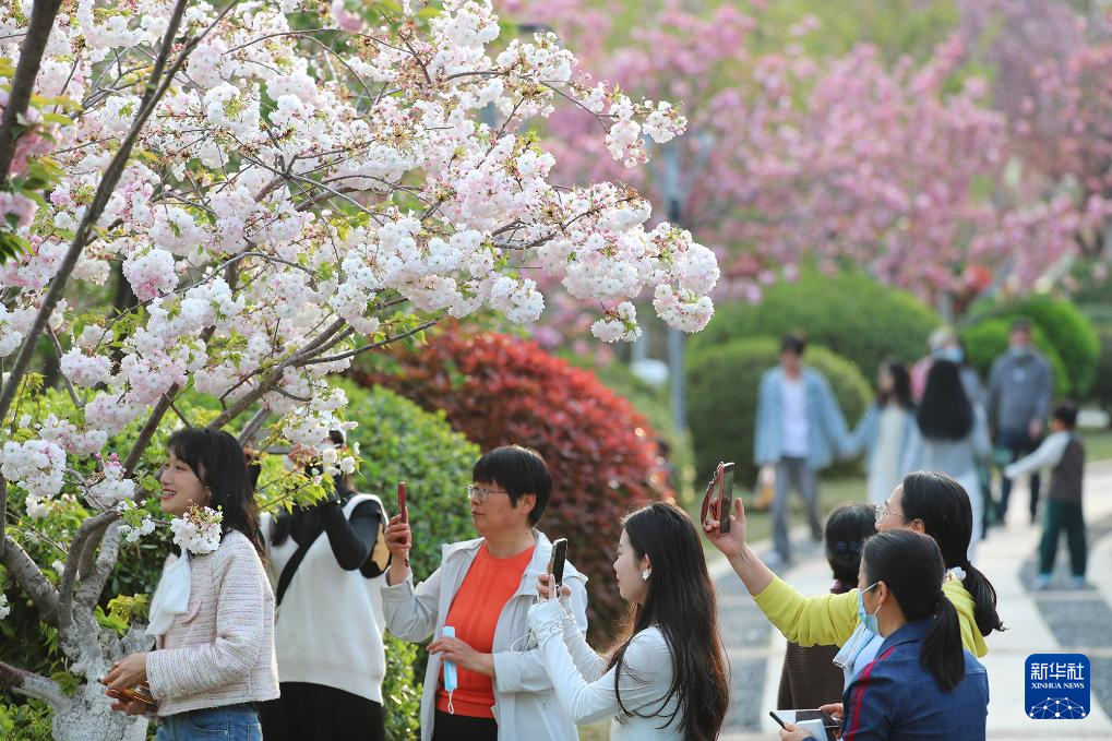 4月8日,市民在河南省商丘市日月湖景区樱花岛赏花游玩。