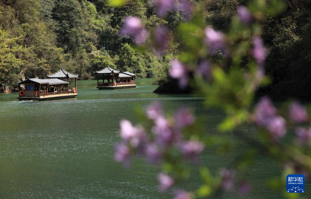4月8日,游客在湖南省张家界市宝峰湖景区乘船游览。